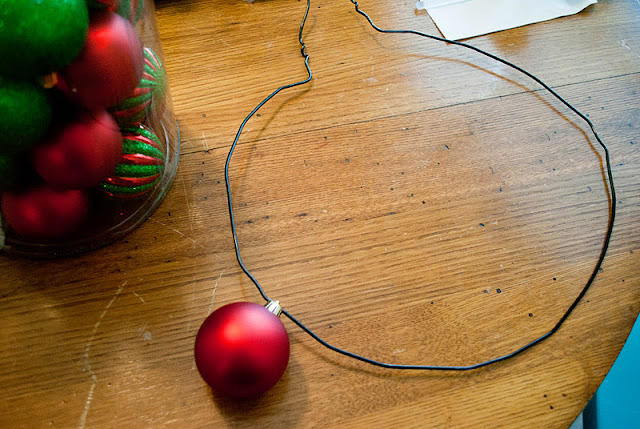 I picked up two big containers of balls at Walmart for 5 bucks a pop. They came with 26 balls in each one, but you really need a few more than 52 to complete this. The original tutorial said to use hot glue to secure the metal cap onto the ball, but when I went to do this, I couldn't pry the off. So I figured they were secure! Yes! But I did have to create a circular shape out of the wire hanger. Not as easy as it might sound. But the good news is that it doesn't have to be perfectly round to work.