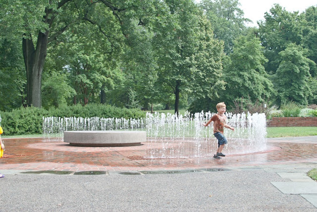 Fletcher took off his shoes after running through the fountain, and didn't want them back on. So we let him wander around barefoot and happy. It gave him better access to splash in puddles and water anyway. Both my littles are drawn to water.